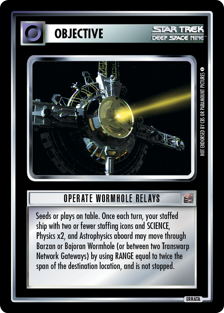 Operate Wormhole Relays has been an innocuously "empty" card for a long time. It originally protected against attacks with Wormhole, but Wormhole is no longer playable as an attack. It also protected downloads of the Bajoran Wormhole, which is now rather immune to being disrupted by download-blockers like Computer Crash by virtue of usually being downloaded in the seed phase (often by The First Stable Wormhole). And so OWR did nothing anymore, and was hardly used. Now we have new text for it, courtesy of the Design Team. The Errata Team usually works to keep cards as similar as possible to their original ideas, but Design makes "brand new cards" all the time. This one just has an old title. Let me turn it over to Dan for his story: