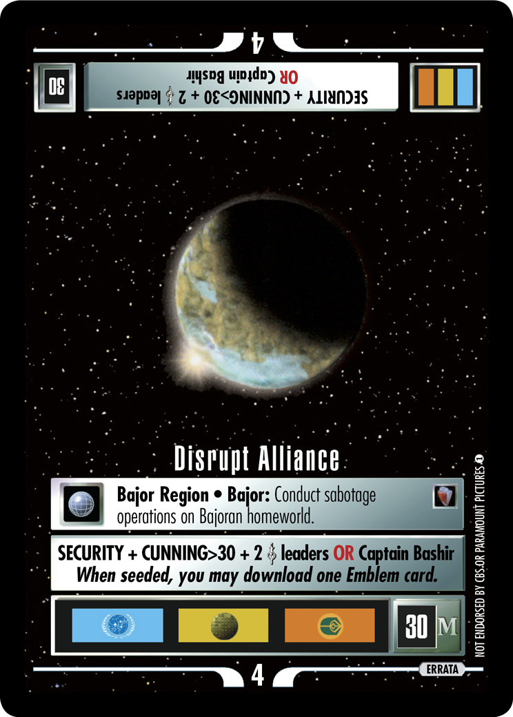 Create your own Deck in the ST1E deck section!There are 19 entries for Disrupt Alliance (ST1E 11 U 41) at the Tradeplace (59 haves and 3 wants). Click here to see all trade list entries for this Uncommon card!