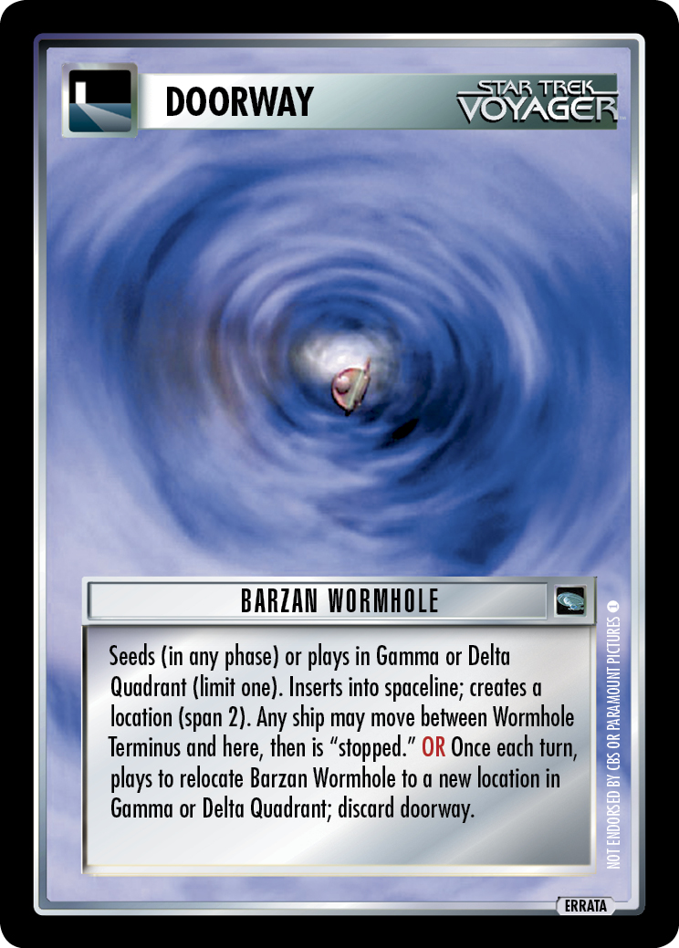 Seeds (in any phase) or plays in Gamma or Delta Quadrant (limit one). Inserts into spaceline; creates a location (span 2). Any ship may move between Wormhole Terminus mission and here, then is "stopped." OR Once each turn, plays to relocate Barzan Wormhole to a new location in Gamma or Delta Quadrant; discard doorway.