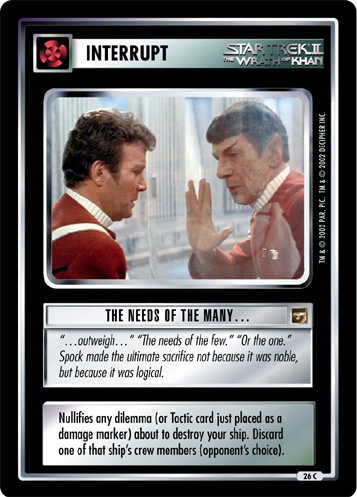 Nullifies any dilemma (or Tactic card just placed as a damage marker) about to destroy your ship. Discard one of that ship's crew members (opponent's choice).