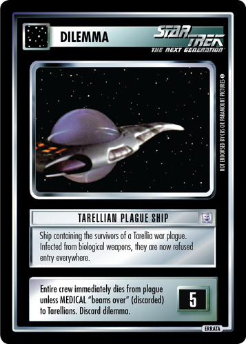 Game text of fist print (without errata): "All ship's crew immediately die from plague unless MEDICAL volunteers to permanentely beam over (discard) to Tarellians. Discard dilemma."