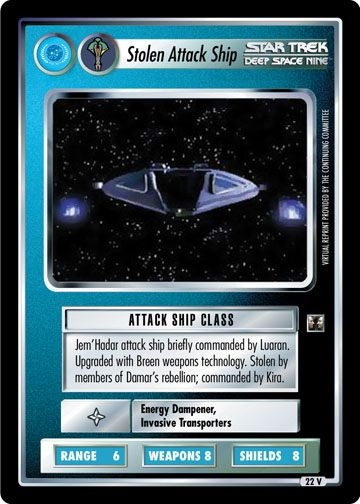 Jem'Hadar attack ship briefly commanded by Luaran. Upgraded with Breen weapons technology. Stolen by members of Damar's rebellion; commanded by Kira.