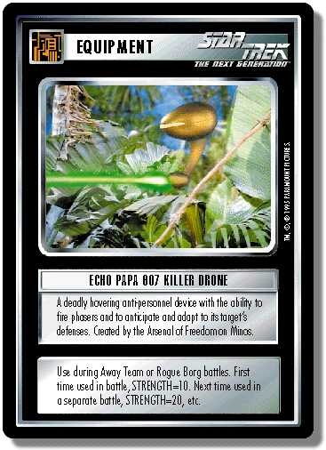 Create your own Deck in the ST1E deck section!There are 73 entries for Echo Papa 607 Killer Drone (ST1E 2 R 34) at the Tradeplace (141 haves and 4 wants). Click here to see all trade list entries for this Rare card!