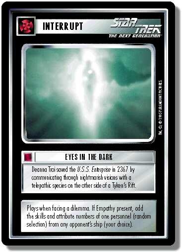 Plays when facing a dilemma. If Emphathy present, add the skills and attribute numbers of one personnel (random selection) from any opponent's ship (your choice).