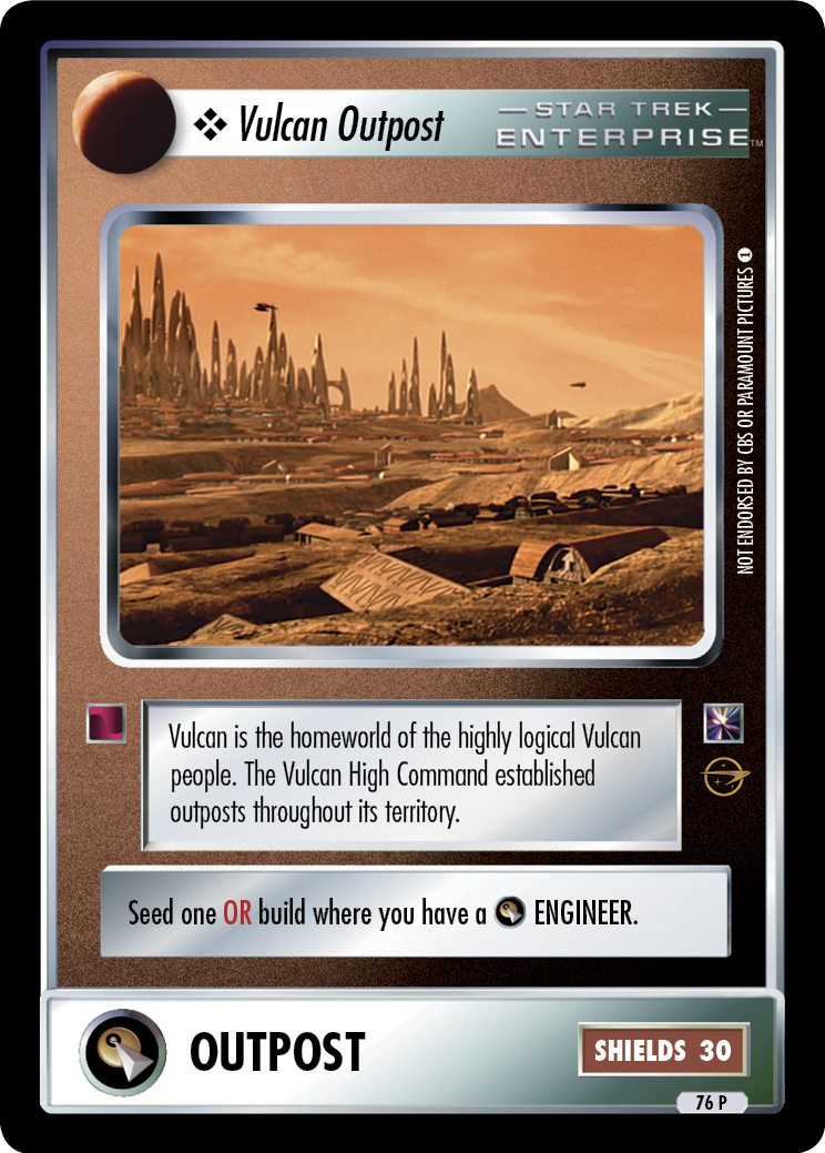 Vulcan is the homeworld of the highly logical Vulcan people. The Vulcan High Command established outposts throughout its territory.