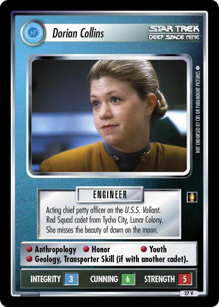 If you play OTF this card replaces the backward compatible 2E card Dorian Collins, Acting Chief Petty Officer from Nessesary Evil - ST1E compatible