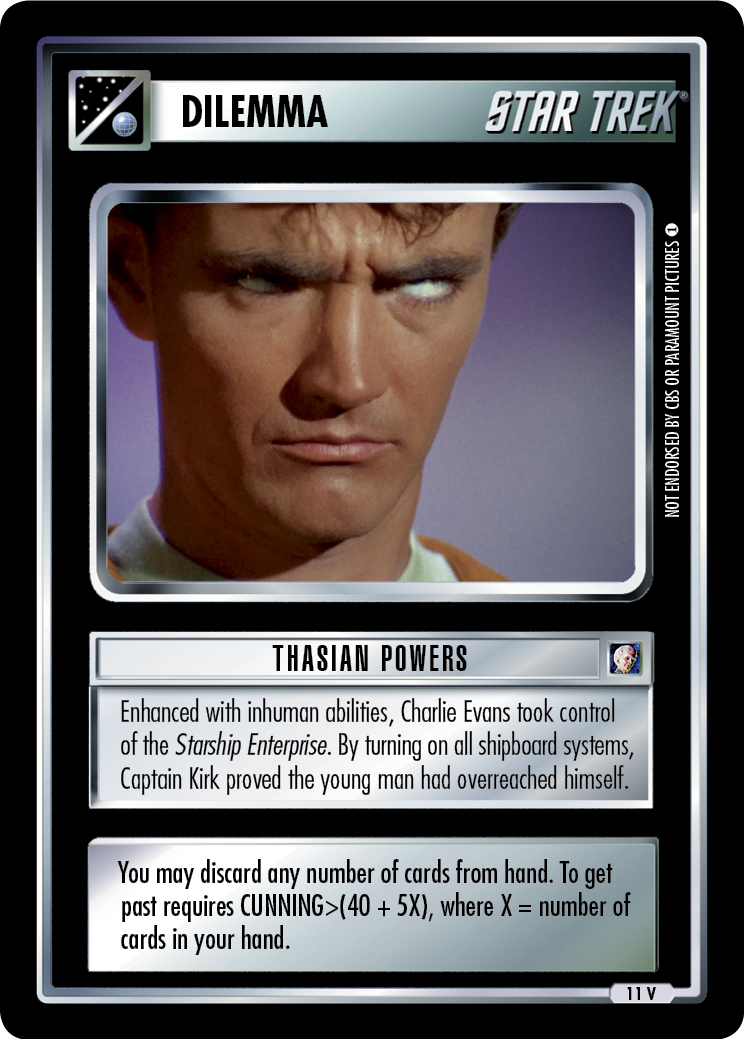 You may discard any number of cards from hand. To get past requires CUNNING > (40 + 5X), where X = number of cards in your hand.