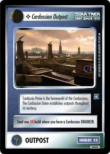 Game text before errata: "Seed one if playing Cardassian OR build later at any location where a Cardassian ENGINEER is present."