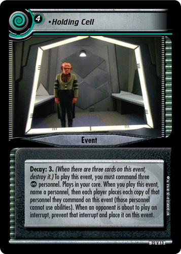 personnel. Plays in your core. When you play this event, name a personnel, then each player places each copy of that personnel they command on this event (those personnel cannot use abilities). When an opponent is about to play an interrupt, prevent that interrupt and place it on this event instead.