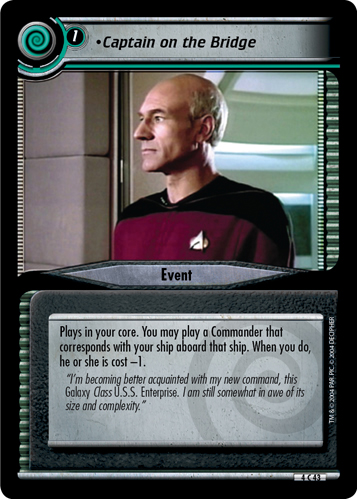 Create your own Deck in the ST2E deck section!There are 6 entries for Captain on the Bridge (ST2E 4 C 43) at the Tradeplace (13 haves and 3 wants). Click here to see all trade list entries for this Common card!
