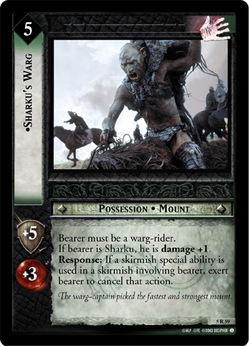 Create your own Deck in the LOTR deck section!There are 3 entries for Sharku's Warg (LotR 5 R 59) at the Tradeplace (5 haves and 1 wants). Click here to see all trade list entries for this Rare card!