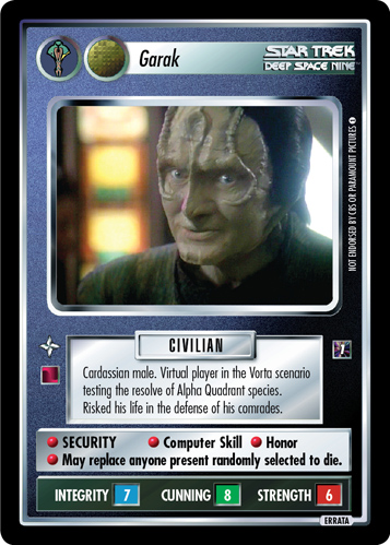 The only personnel card with a built-in Security Sacrifice! When the Dominion placed the crew of Deep Space Nine in a computer-generated fantasy world, one of the artificial players they encountered was Garak. The “virtual Cardassian” made the ultimate sacrifice for his companions during their attempt to destroy the Bajoran wormhole.
