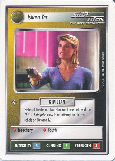 These openCards members have "Ishara Yar" either as "Have" or as "Want" in thier ST1E tradelist. To intitiate a trade, send a openCards "private Message" with your offer to a member on this list (click on "PM" behind the members name).
